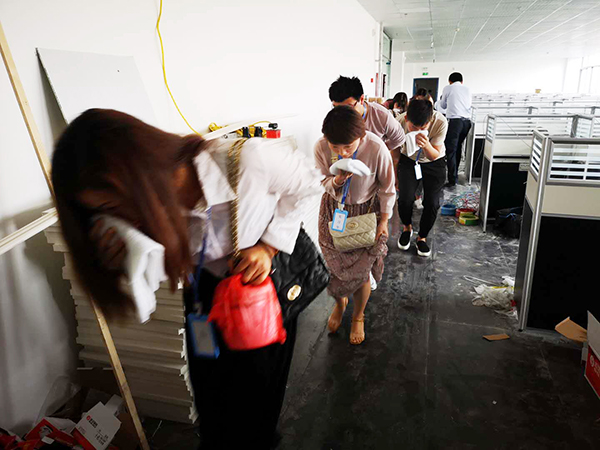 警報響起,疏散引導(dǎo)人員組引導(dǎo)員工與業(yè)戶開始向疏散走道、安全出口緊張有序的進(jìn)行疏散。