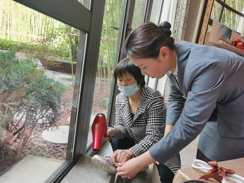 見此情景,項(xiàng)目客服人員來不及多想,穿著高跟鞋就直接踩進(jìn)水里,抱起孩子,順利把孩子交給奶奶后,客服不放心,擔(dān)心鞋子濕了會影響孩子的健康,去二樓拿吹風(fēng)機(jī)把孩子濕透的鞋襪吹干了,奶奶感激的說到:“小孩子太調(diào)皮了,謝謝,謝謝你們!”“您客氣了,這是我們應(yīng)該做的”客服微笑著回答。